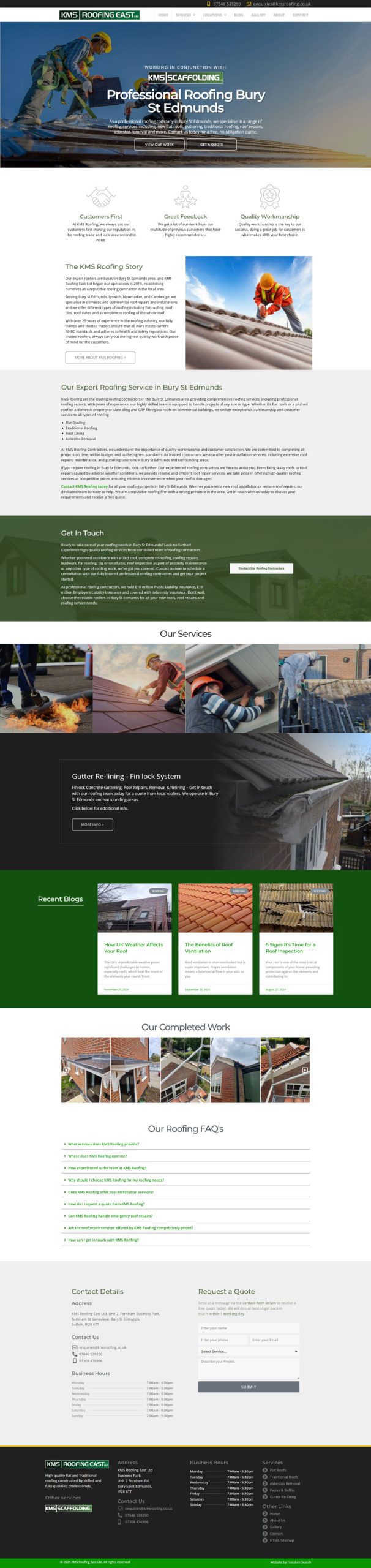 Located in Bury St Edmunds, KMS Roofing stands as a trusted name in roofing services, offering everything from flat roofing and traditional pitched roofs to asbestos removal and roof repairs. With a reputation for exceptional craftsmanship and customer satisfaction, their skilled team delivers high-quality solutions for both domestic and commercial properties. To highlight their expertise and commitment to timely, budget-friendly results, Freedom Search designed a modern digital platform that mirrors KMS Roofing’s dedication to excellence. This user-friendly website not only showcases their wide range of services but also ensures customers can easily connect with the team for all their roofing needs.